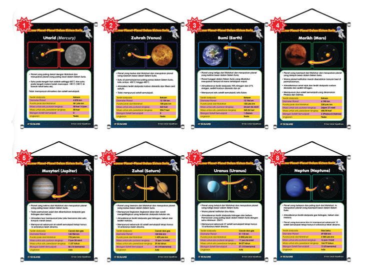 Sistem suria terdiri daripada matahari, lapan buah planet, satelit-satelit semula jadi yang mengelilingi planet-planet, asteroid, meteoroid dan komet. Matahari merupakan objek yang terbesar dan menjadi peranan penting di dalam Sistem Suria, lapan planet yang terdapat dalam sistem suria iaitu Ularid, Zuhrah,Bumi,Marikh,Musytari, Zuhal, Uranus dan Neptun. Bumi merupakan planet ketiga dekat dengan matahari dan juga merupakan planet yang kelima besar di Sistem Suria. Set banner ini disediakan berkenaan Sistem Suria, iaitu salah satu modul pembelajaran dalam Doukumen Standard Sains KSSR. Setiap banner mempamerkan gambar planet dan memberikan keteranan berkenaan planet tersebut. Set banner ini sesuai dipamerkan di perpustakaan atau makmal sains untuk menambah ilmu pengetahuan murid-murid atau digunakan sebagai bahan bantu mengajar.